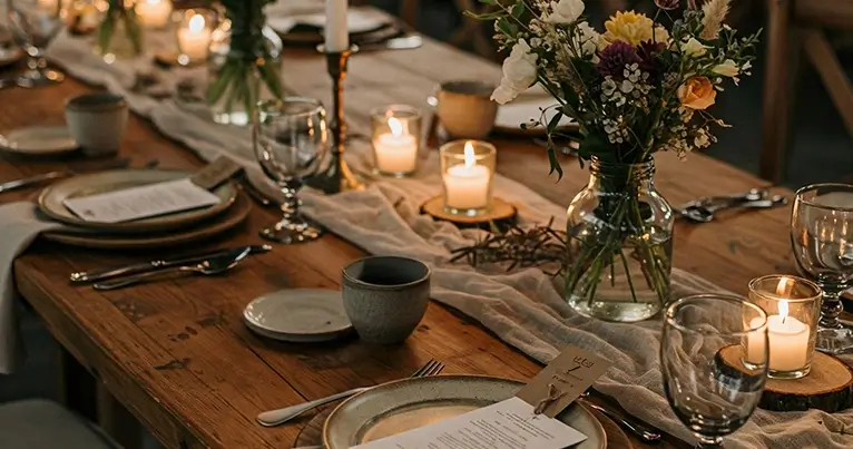 Naturalne materiały: W dekoracjach królują drewno, len, papier recyklingowy i inne naturalne tkaniny. Zamiast klasycznych obrusów, popularne stają się drewniane podkładki i ceramiczne naczynia, które dodają stołom rustykalnego uroku.