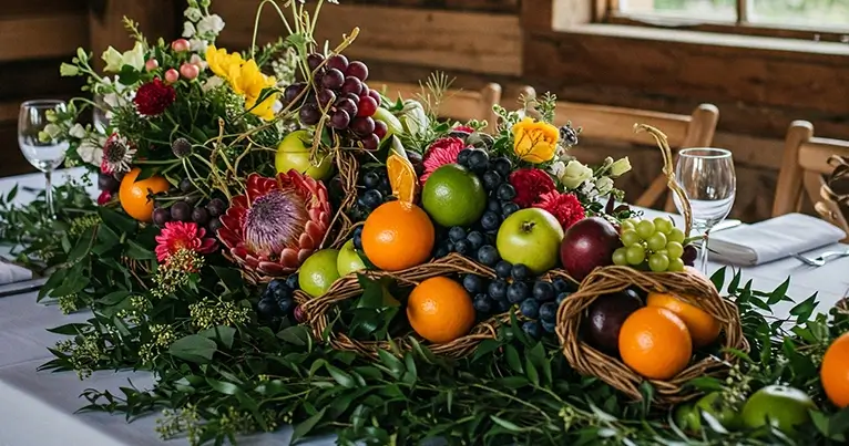 Owoce i warzywa w kompozycjach kwiatowych: Świeże owoce i warzywa stają się coraz popularniejszym elementem dekoracji stołów weselnych, dodając im oryginalności i świeżości.